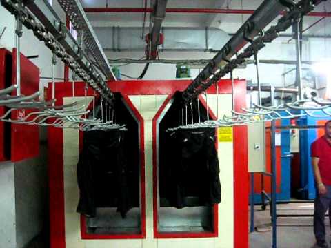 Le système de convoyeur est un mécanisme appelé type Webb (I Beam Type). Les cintres montés sur la chaine peuvent se mouvoir sur NPI 80-100 prol. La capacité de transport de charge des cintres est de 140 kg/m. la distance entre les cintres est de 600 mm. Sur le convoyeur à tous les 600 mm il peut être suspendu en moyenne 4 pantalon.